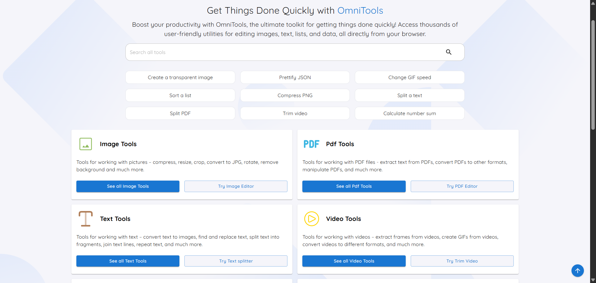 Welcome to OmniTools, a self-hosted web app offering a variety of online tools to simplify everyday tasks. Whether you are coding, manipulating images/videos, PDFs or crunching numbers, OmniTools has you covered. Please don't forget to star the repo to support us. Here is the demo website.